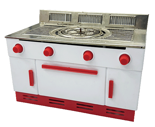 昭和44年に発売された大ヒット商品。実際にホットケーキを焼くことができ、『おままごと』の世界に衝撃をもたらしました。当時のおもちゃとしては高価で、子どもたちのあこがれでした。